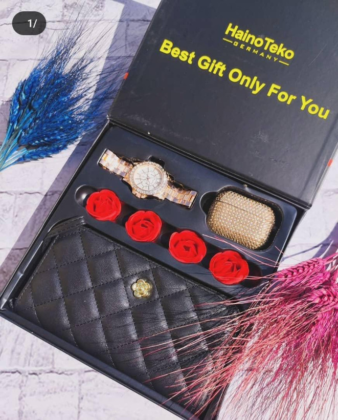 اقلام همراه: کیف پول/ساعت فول نگین/ایرپاد فول نگین/۴عدد گل رز