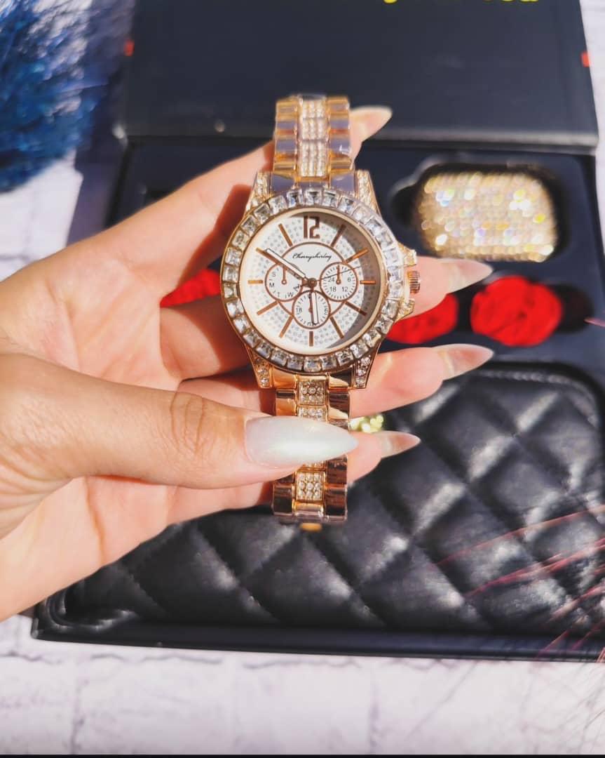 اقلام همراه: کیف پول/ساعت فول نگین/ایرپاد فول نگین/۴عدد گل رز